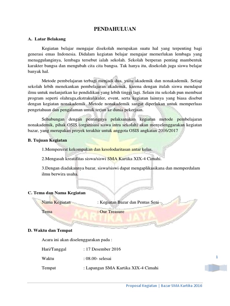 Ketika berkecimpung di dunia organisasi pasti kamu akan banyak membahas mengenai proposal, atau bahkan terlibat dalam pembuatannya. Rancangan kerja tersebut nantinya akan dilaksanakan sebagai. Temukan apa yang kamu cari disini lengkap dengan cara ada contoh proposal kegiatan sekolah, pentas seni dan masih banyak lagi. Demikian proposal ini kami sampaikansebagaiacuandasardari bazar buku.atasbantuandanpartisipasinyadarisegalapihak. Apakah kalian pernah mendengar istrilah dari proposal kegiatan?