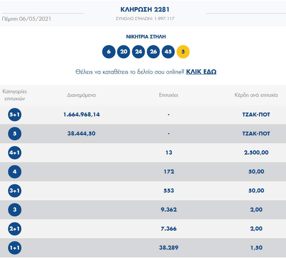 Αυτοί είναι οι τυχεροί αριθμοί την κυριακή 18 οκτωβρίου. Στην κληρωση τζοκερ την τετάρτη 28/4/2021 με κωδικό 2278 οι αριθμοί που κληρώθηκαν ήταν 23, 32, 42, 43, 45 ενώ στη θέση του τζόκερ κληρώθηκε ο αριθμός 13. Τζόκερ, λαχεία, οπαπ » εθνικό λαχείο 2021. Από το παρακάτω πίνακα βλέπεται τις 10 τελευταίες κληρώσεις του τζοκερ την ημερομηνία, μήνα, αύξων. Μετά από 12 τζακ ποτ και λόγω της χθεσινής εθνικής εορτής σήμερα το βράδυ η κλήρωση του τζόκερ.